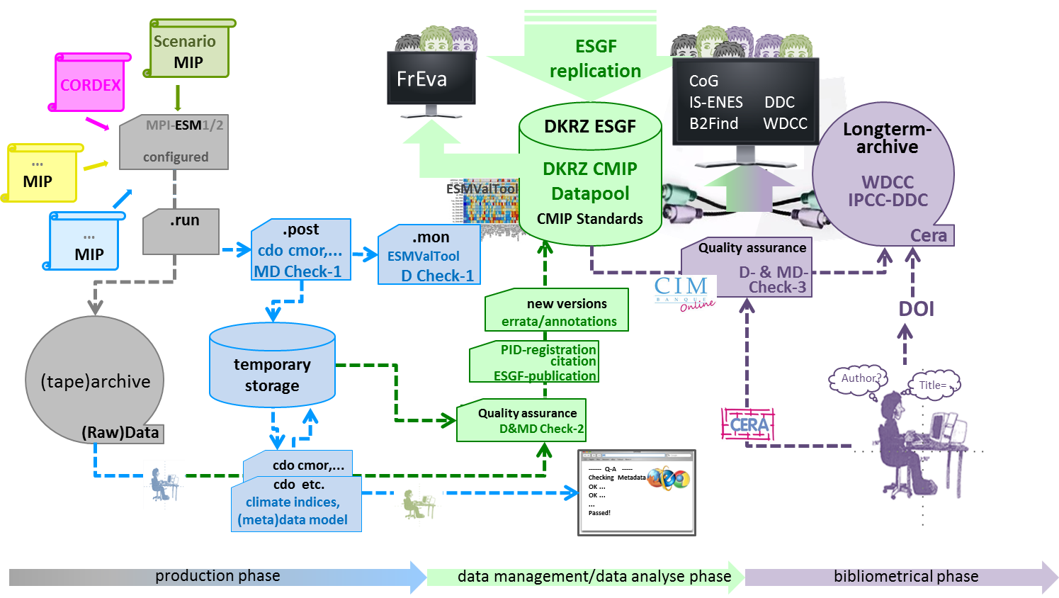 CMIP6 data workflow steps at DKRZ starting with the model integration and ending with long-term archiving with DataCite DOI assignment.